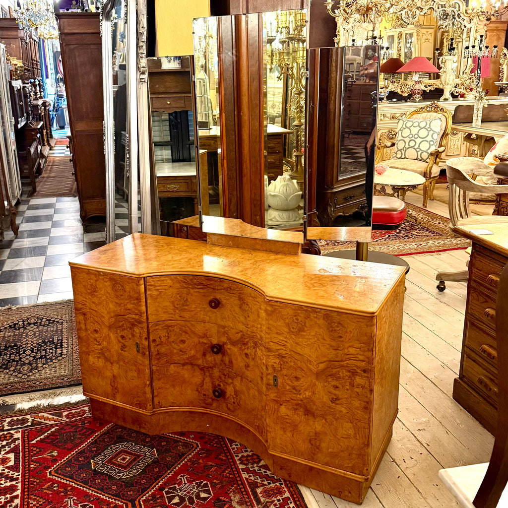 Art Deco Curved Burr Walnut Dressing Table with Triptych Mirror